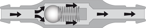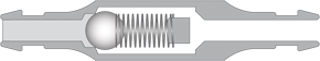 The depiction below shows the miniNAV in the horizontal position. The ball-cone valve is closed and drainage is prevented. Increasing intraventricular pressure (IVP) will eventually overcome the spring force, which normally would keep the ball-cone valve closed. The closing ball is pushed away from the cone seal and a gap opens for CSF drainage.