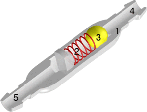 The miniNAV was developed as a more compact valve that demonstrates improved performance in terms of obstruction-related problems and resistance against subcutaneous pressure. The depiction below shows a schematic cross section of the miniNAV. The miniNAV consists of a robust titanium casing (1) whose proximal end contains a ball-cone valve. A spiral spring (2) maintains the opening pressure of the ball-cone valve and the sapphire ball (3) ensures precise closure of the valve. The inlet port (4) and the outlet port (5) are also constructed of titanium.
