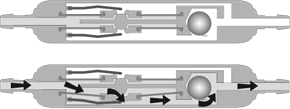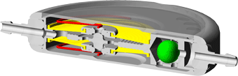 The DUALSWITCH-VALVE consists of two parallel chambers, one for the patient’s supine and one for the patient’s upright position. This construction allows the valve to distinguish between the horizontal and vertical position of the patient. The robust titanium casing (grey) contains two titanium discs connected to the casing by two silicone membranes (yellow). Two bow springs (red) act on the discs and determine the opening pressure required for each chamber with their respective preload force. The tantalum ball (green) acts as a “switch” in case the patient gets up. In this way, overdrainage is prevented.