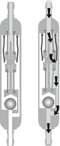 Some patients treated with a shunt system face the risk of valve blockage due to the presence of blood in the cerebrospinal fluid (CSF). A high protein level or tumor cells in the CSF can also lead to valve blockage. These issues were given particular consideration in the development of the DUALSWITCH-VALVE. The robust titanium casing consists of two parallel chambers that present a very large surface area to the CSF. A large area also allows a higher force, which is provided by a relatively stiff spring, making the valve mechanism effectively immune against any of the problems associated with proteins, blood or tumor cells.